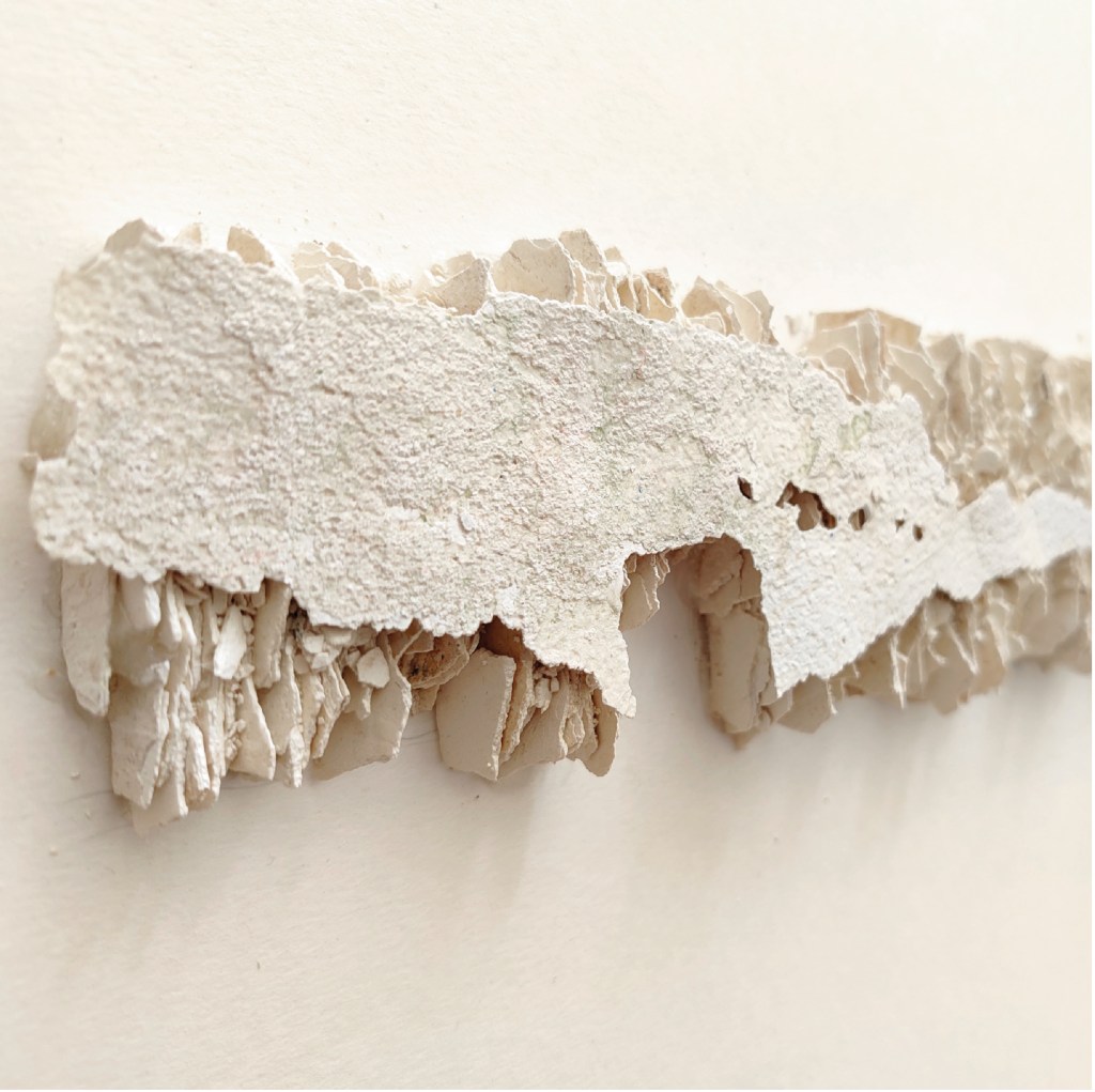 Il en résulte une lumière particulière. Les écailles de chaux tracent une ligne au milieu d’un brun qui paraît profondément limpide, parfois incrustées dans une boursouflure de terre crue comme une pincée de clarté captée au vol, ou simplement utilisées telles quelles, créant des formes blanches dans un blanc complet. Ces formes collées, ramassées, alignées, structurées de manière à créer une présence au sein de la présence.